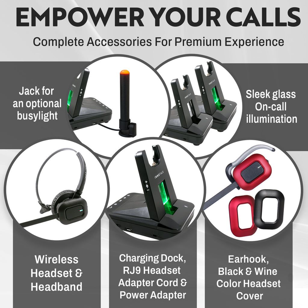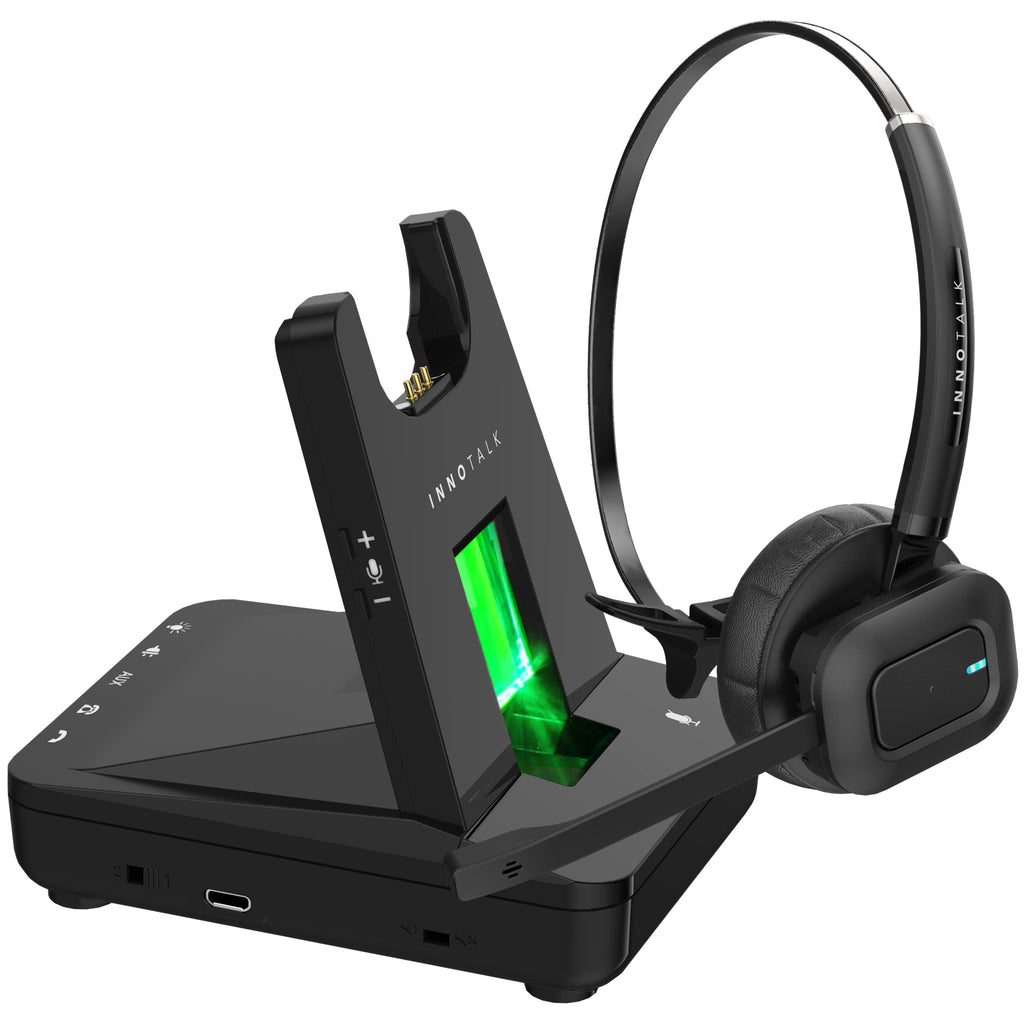 The amazing Pioneer wireless headset allows you to roam your office while you talk with up to 300 feet of range to roam your office. You'll improve productivity as you're able to gather information throughout your office while continuing to talk. The INNOTALK Pioneer wireless headset provides convertible choice of a headband and ear loops for those who prefer to wear it around the ear in black or wine color. With two wearing styles included, you decide what's best for your all-day wearing comfort. Using the over-the-ear application, the INNOTALK Pioneer only weighs 0.7 oz, the super light headset in the commercial grade industry. Opting for the headband will provide a secure fit with a soft ear cushion sealing out sound from your environment, giving you a clear and crisp conversation with your caller. In addition it gives you 8 hours of talk time to get you through a busy day. Placing it on the charging base while you are at lunch, or its not in use, helps to extend the talk time. The newest DECT Technology helps eliminate Wi-Fi interference, and allows you to have up to 38 units in one area before you start diminishing your range. If you need to have other colleagues shared a base with you, you can set three headsets on a same base. Also you have volume and mute controls on the earpiece, so no matter where you are you can adjust the volume accordingly. This headset is equipped with all the technology of today, and more serious about getting more done in a busy work day.
